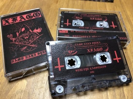 Xfagoという名前を見かけたのは昨年の秋頃だった。その名前からSarcófagoへのリスペクトが滲み出ている。Sarcófagoとは「石棺」のことで、fagoはギリシャ語起源の接尾辞で「食べる」を表すそうだ。伝説的なカルト・バンドには名前をもじったフォロワーが付き物。語源なぞ知ったことかとNecrófago、Impietyの前身Sexfago、来日を果たしたDeiphagoも改名前はDeifagoだった。そしてようやく日本でもそろそろ2020年も見えてきた頃に現れた。しかもABYSS BESTIAL SORCERER (Dr, Vo) なる人物(?)のワンマンバンド。黒装束に光る眼、そして明らかにSarcófagoのガンベルトの装いを模した縄。2017年末にはハードコア不法集会「地獄のコミュニケーション」にてオーディエンスに強烈な印象を残したのち死亡を確認。…かと思いきや今年2月にXANTHOUS ARMORED TROOPER (Gt) が「増殖」してデュオスタイルで復活。この「増殖体」の風体も実に怪しい。Sodomのカバーアートによく登場する兵隊のようにも見えるが、それより映画「狂い咲きサンダーロード」の仁であろう。ウォー・ベスチャルスタイルは見かけも重要だ。SarcófagoがSarcófagoたらしめたのは音楽性だけではないのだ。この「二体」の装いはまさにそういうことだ。