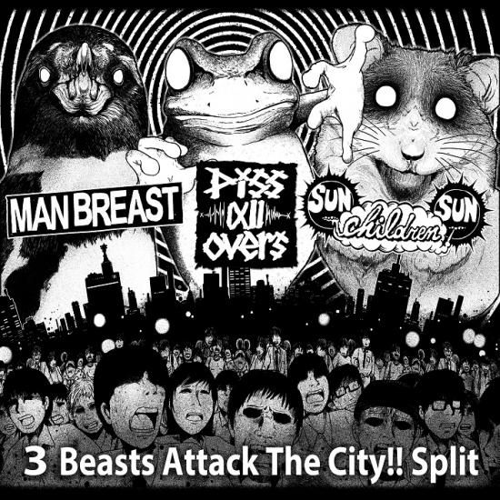 SPAZZやGOD STOMPER的ノンビートダウン・パワーヴァイオレンスの若手ギターレスデュオMAN BREAST、常時脱臼しっぱなしの曲展開で人を煙に巻く秩父異端児ベースレスファストコアpiss all overs、自称ちんどんコズミックプログレッシブフューチャーパンクfrom鶯谷ことSUN CHILDREN SUNとギターやらベースやらディストーションやらあれこれと足りないヤツラの揃い踏み3wayスプリット!