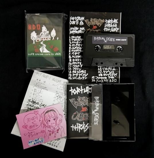 ステッカーとインサートのバンドロゴはスペイン超速ノイズスラッシュ伝説グループRUIDO DE RABIA調なのは納得できるもジャケットはアメリカ80'sハードコアバンドFLAG OF DEMOCRACYの1stアルバムそっくしなのがこれまた意味不明 、、さて再生してみるとこれまたいつちゃんとした曲が始まるんだろう?と錯乱したビート無視のドラム、ガシャガシャとこれまたコード無視の壊れたギター音、ヨダレを垂らしながら泥酔して呻くような情けないヴォーカルのどうしようもない状況が延々と続く、、、まま終わってしまい、しまった何てモノを聴いてしまったんだ!!と呆然としてしまったワタクシ、、そう、これぞまさにBURIBURI DE OGEEが意図したTORTURE THRASH = 拷問スラッシュなわけなんですね!