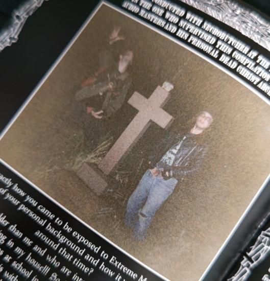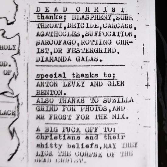 コープス・ペイントにAXEGRINDERのシャツを着て弾丸ベルト5寸釘を装着したメンバー写真他沢山の武装メンバー写真やファンジンのインタビュー、オリジナル作品のアートワーク、歌詞等が掲載されたブックレットを読み進めていきますと要はハードコアパンク〜クラストシーンが盛んだった1980年代後期〜90年代初期の地元ブリストルにおいてAMEBIXやRIPCORD、ONSLAUGHT等を聴いて育った若者が友達が少なすぎたのか当時頭角を現したBEHERITやBLASPHEMY、SARCOFAGOそしてDREAM DEATHやSAMAELといったDOOM BLACK DEATH、ROTTING CHRISTをはじめとしたギリシャBLACK METALに触発され結成、ノルウェーMAYHEMのEuronimous氏とも交流しながら活動していたグループがこのDEAD CHRIST!