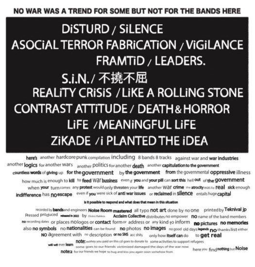 このcompilationは軍国主義支配層が2月に開始した戦争という圧倒的な暴力に巻き込まれた我々の友達/Punksをサポートする目的でリリースされるものです。