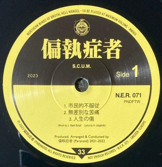 ジャケットもZYANOSE ”Chaosbender” の12インチ・バージョンに通ずるものがあるし(ただしアートワークを担当したのはドラムのEmil氏)ともすればサウンドも?と今回はMETAL PUNK的側面とCRASHER NOISE MANGEL的側面の二極的個性を持つ偏執症者 (PARANOID)というグループの両局面が融合した作風となっており、ノイジーかつメタリックかつスカンジナヴィアンD-TAKTかつCRASHER NOISE COREなこのグループの出し得る魅力が一斉に放射されたかの集大成的作品となっております!キマッタね!!