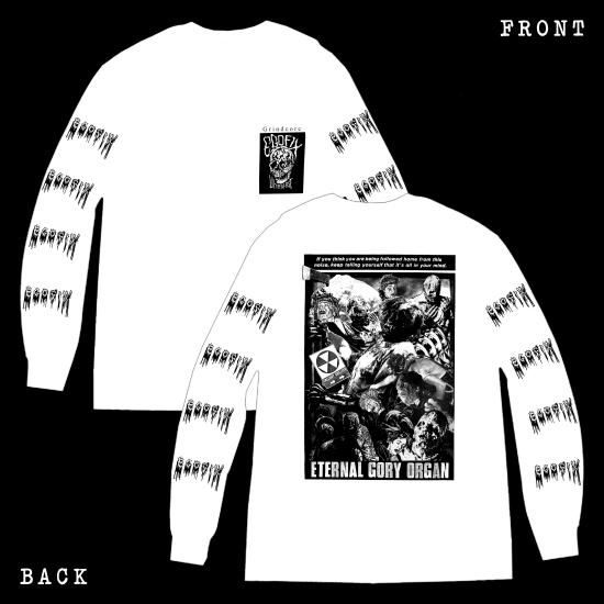 両面プリント、フロントは胸にワンポイントでULTRA FAST, バックには生きる屍どもが蠢く終わることの無い血みどろの恍惚か?!をテーマにしたコラージュ作品をプリント。