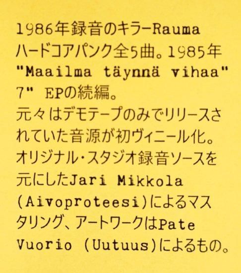 1985年リリース、唯一の激レア7"EP”Maailma Taynna Vihaa"で知られる80's FINLAND カルトRAW DESTRUCTIONハードコアパンク・グループPOHJASAKKAの、翌年1986年にカセットのみで少数リリースされていたとされる5曲入り音源が、元気な現行レーベルFINNISH HARDCOREにより2022年初レコード化!