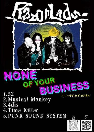 全5曲入り、既にライヴ会場等での手売りで300枚プレス中100枚くらい売ったってんですから大したもんです!まあ彼等にしてみれば関係ねえ事なんでしょうけども : NONE OF YOUR BUSINESS!!