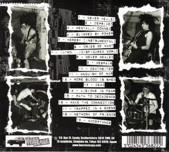 長らく廃盤となっていましたがついにリプレスです!『NETWORK OF FRIENDS』は最もPUNK/HARDCOREシーンに根付いた言葉、自らのサウンドを形容した『HYPER FAST SPEED-CORE THRASH』、解散時に残した『俺達はHERESY時代に、実に多くのことを学んだ。違う文化を持った多くの人達に会い、ツアーを通して北ヨーロッパ各地の様子を実際に見る事もできた。だが様々な体験から学んだ一番大きなことは、パンク・ロックの世界にドップリ漬かり、あまりにもシリアスに物事を捉えてがんじがらめになるよりも、すべてを笑い飛ばせるだけのユーモアのセンスを持つ事の方が大切だということ。』わずか4年間でバンドに全てをつぎ込んだだけあって彼らの残したは偉業は素晴らしい。PUNK/HARDCOREでスピードを語る上で最も有名なUK HARDCOREバンド(当時のリリース作品のプレス枚数を考えるとやはり凄いバンドなんです!)なのは周知の通り。彼らの影響下のあるバンドは数えられないくらい存在しています。未発表となる1st STUDIOテイク7曲を始め、3000枚プレスして世界中のディストリビューターの手に渡りその存在を知らしめたデビューFLEXIシングル「NEVER HEALED」(EARACHEと共同リリースってのも重要!)、サポートしてくれた人に感謝の意を込めてリリースされたという、まさに彼らが大注目となるUS HARDOCOREも吸収した最重要シングル「THANKS! EP」(500枚プレスで赤、青、黄、緑の各125枚というコレクターズ・アイテム!ちなみに当時MAXMUM ROCKNROLLの広告には一切再プレスはしない!と載っていたにも関わらずアッという間に無くなってしまい追加で200枚プレスされた黒盤も存在する)も収録!初期のデモはドラムのキックの音が半端なくドタバタで、それが相乗してもの凄いスピード感が味わえ最高!リヴェシーのヴォーカルも他のUKハードコアより言葉数が多くヨーロッパのバンドを思わせこれがまたカッコいいんです!言ってしまえば'NEVER HEALED'よりも音が沈んでなくかつRAWで中期以降のHERESYとは全く別な音で最高。そりゃテープ・トレードしていた当時のスピード・フリークスから絶賛される訳ですよ!