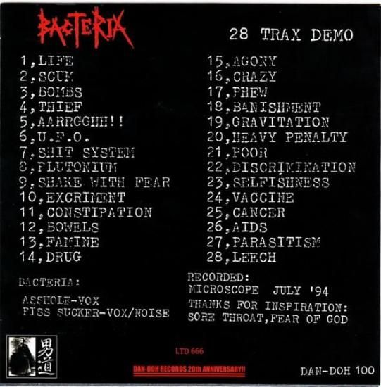 このBACTERIAとゆうユニットは時期的にみてもまだサタニズムとは無縁だったようで曲名とかを見ても"SHIT SYSTEM"とか"SCUM"とか非常にPUNK的です。しかしこのグラインドとゆうよりは純粋なギター・ノイズを使った即興演奏ともとれる音は10年後のGOATWORSHIPPERを十分に想起させる音で慄然とせざるを得ません!