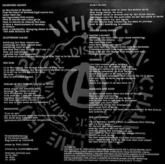 これまで通り初期DISCHARGE、そして先人DISCLOSEが提唱したDISBONESサウンドを基盤にしつつ、その尋常ならぬテンションで繰り出されるリズム隊によりCONTRAST ATTITUDEのバンドとしてのトータル・クオリティーは飛躍的にアップデートされ、新たな可能性への扉を一蹴のうちに解放、ここにおいてRAW PUNKもD-BEATもCRUSTもJAPANESE HARDCOREもCROSSOVERもその全てが一丸となり新生CONTRAST ATTITUDEサウンドとして提示される全10曲!
