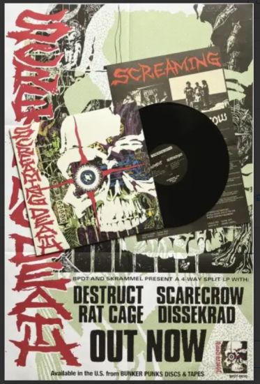 もしや?と思われた方もおられるでしょうが本リリースのインスピレーションの元となったのは日本のSELFISH RECORDSが1986年にリリースした傑作オムニバスLP "THRASH TIL DEATH”なんだそうで以前より交流のあったこの4グループで「俺達もあんな歴史に残るすごいオムニバスを作ろう!」とSCARECROWドラマーUsman氏運営アメリカBunker Punks Discs & TapesとDISSEKERADベーシストMattis氏運営スウェーデンSkrammel Recordsの2大レーベルの共同リリースにて実現!